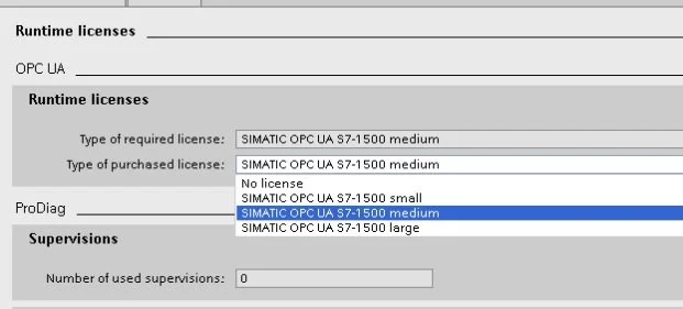 In the Properties>General menu, look for the Runtime Licenses selection. Click on it and look for the OPC UA>Runtime licenses click on the ‘drop down menu’ and make sure to match the Type of required license and Type of purchased license selection. To make sure, you have the correct runtime license before downloading to the PLC. Purchase a license from your Siemens distributor for the correct usage of the PLC runtime.
