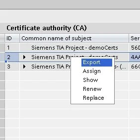 Create and aet CA Certificate in a running TIA Portal project with “Use global security settings for certificate manager” and Project Security Enabled (see prerequisites). TIA Portal automatically creates a CA certificate. To verify this on TIA Portal under Project Tree>Devices>Security settings>Security features double click on the Certificate Manager to open the existing certificates.