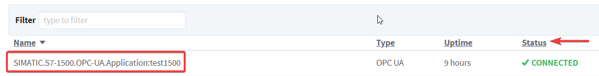 In this page, Ignition will display the current OPC connections, and the Uptime of the connection. Look for the OPC connection we created to the server (default name should be something like SIMATIC.S7-1500.OPC-UA, unless the user defined a custom name) and look for the Status indication. If successful it will show CONNECTED, indicating that we have working connection between OPC Server and Ignition Client.