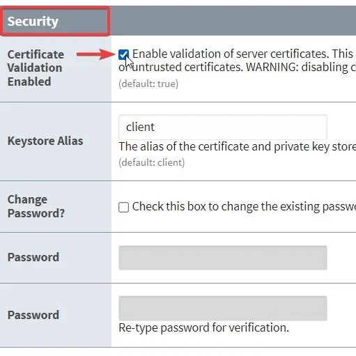 Note: After Password has been set, click on the checkbox “Show Advanced Properties”. Look for the section Security in this section there is a checkbox for Certificate Validation Enabled, if needed for troubleshooting, you can uncheck this option. This will allow Server and Client to ignore the trusted certificate and communicate. Beware that Disabling certificate validation compromises the security of this connection and should just be used for testing purposes of a connection.