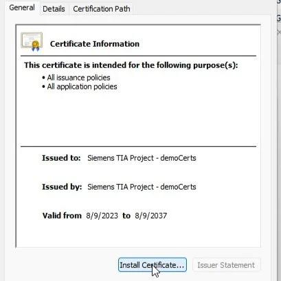 The export will open a file explorer window where you can select the location you want to save the exported certificate. Take a note of this location so you can easily access it and import the certificate in the client in the upcoming part. TIA Portal can export the certificate in different file types. For the connection we are doing, we need the (.der) Der coded (unencrypted) file.