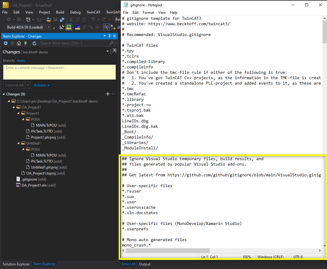 There are still files visible here that are specific for the Visual Studio environment which is incorporated in the TwinCAT 3 environment and are not part of the plc project. This is the highlighted .suo file. In order to ignore it we can simply add another record to our .gitignore file. You may get a predefined template for Visual Studio here, just like we were able to accomplish for the TwinCAT 3 ignore extensions. It content only needs to be copied, then pasted at the end of our file.